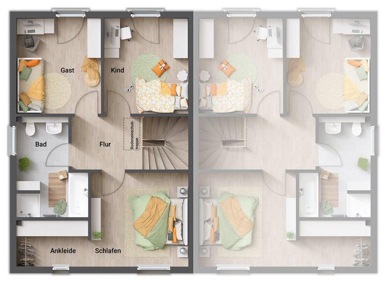 Das Doppelhaus Aura 115 ist die ideale Kombination aus urbanem Lebensgefühl und ländlichem Charme – und bietet viel Raum für eigene Ideen.