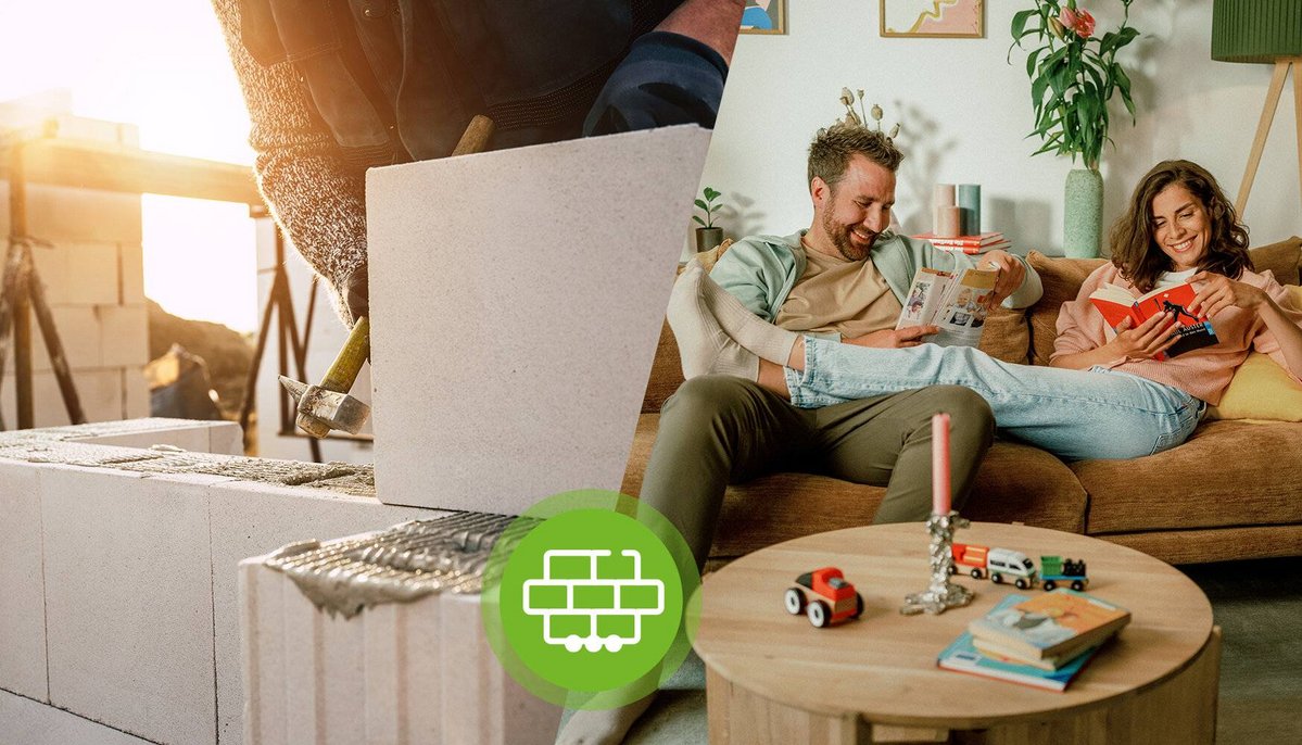 Mit einem Town & Country Massivhaus sind Bauherren optimal aufgestellt. Zum Einsatz kommt Porenbeton – ein regionaler Baustoff, der umweltschonend aus den natürlichen Materialien Branntkalk, Quarz, Sand und Wasser hergestellt wird. Die Steine überzeugen nicht nur mit ihrer Langlebigkeit, sondern auch mit sehr guten Wärmedämmeigenschaften. Deshalb können Häuser aus Porenbeton mit einer vergleichsweise geringen Wandstärke gebaut werden. Geheizt wird regenerativ über eine Wärmepumpe in Kombination mit einer Fußbodenheizung. Beide Komponenten sind in der umfangreichen Vollausstattung eines Town & Country Hauses inbegriffen. Ebenfalls enthalten ist eine Photovoltaik-Vorrüstung, die es Bauherren ermöglicht, sich komplett unabhängig von fossilen Energieträgern zu machen. Dann, wenn sie es wollen.